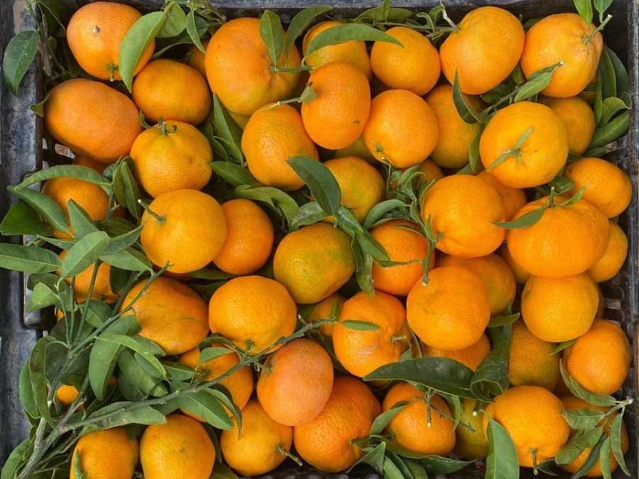 Presentación · Mandarina con hoja, imagen premium.
